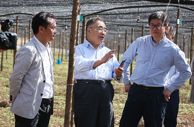 中國中醫(yī)科學(xué)院中藥研究所所長陳士林(右一)、中國工程院院士張伯禮(右二)在苗鄉(xiāng)三七董事長余育啟(右三)陪同下參觀苗鄉(xiāng)三七基地