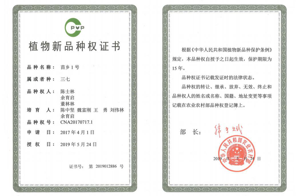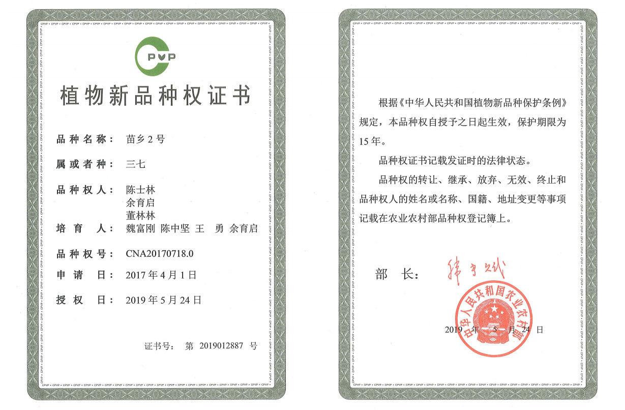 2019年,首次獲批國家植物新品種權(quán)的三七新品種——苗鄉(xiāng)1號、苗鄉(xiāng)2號誕生。