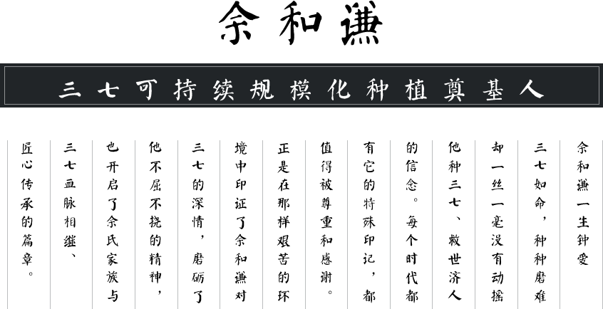 抗戰(zhàn)勝利,余和謙辭去飛虎隊(duì)后勤軍酒廠技術(shù)員服務(wù)員,到文山馬關(guān)農(nóng)場一個種三七的親戚家要了一衣兜紅籽(三七種子),回到喜古鄉(xiāng),開始在自家土地里種植三七。